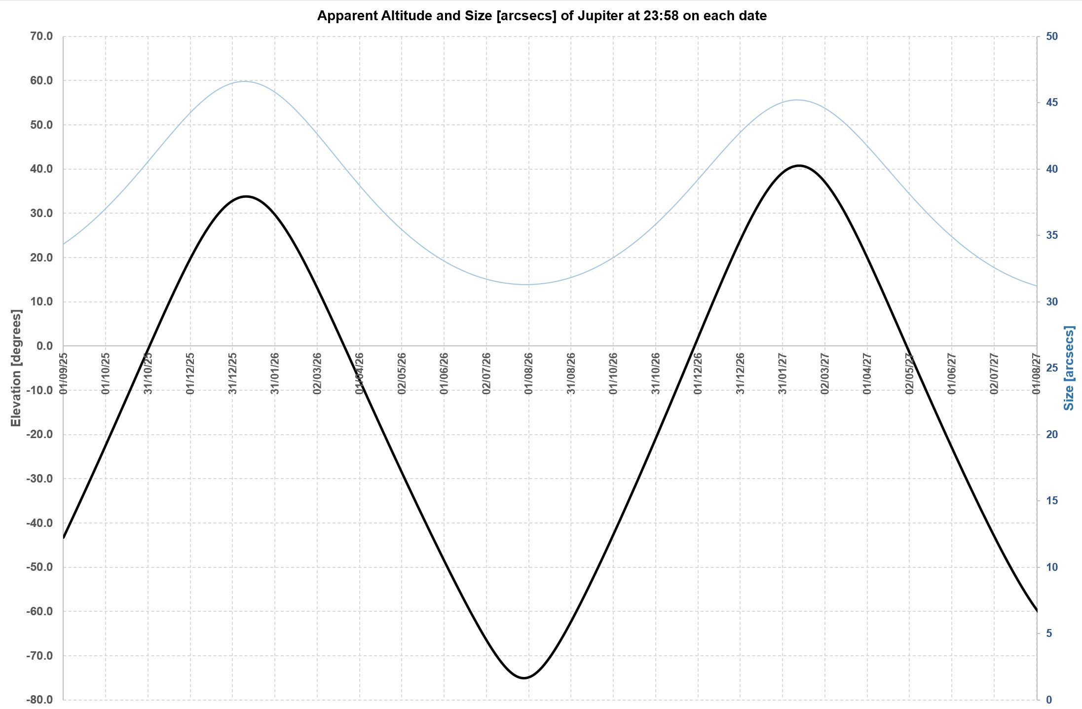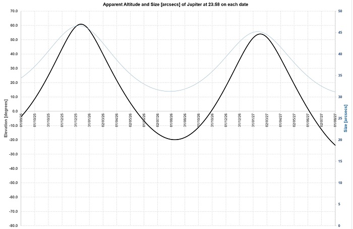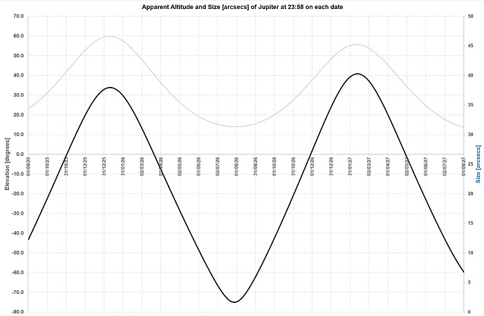 So Jupiter will culminate in December 2025 at over 60 degrees up for us in the NH, as high as it ever gets so a real treat, taking 3 months or so to “get up” and