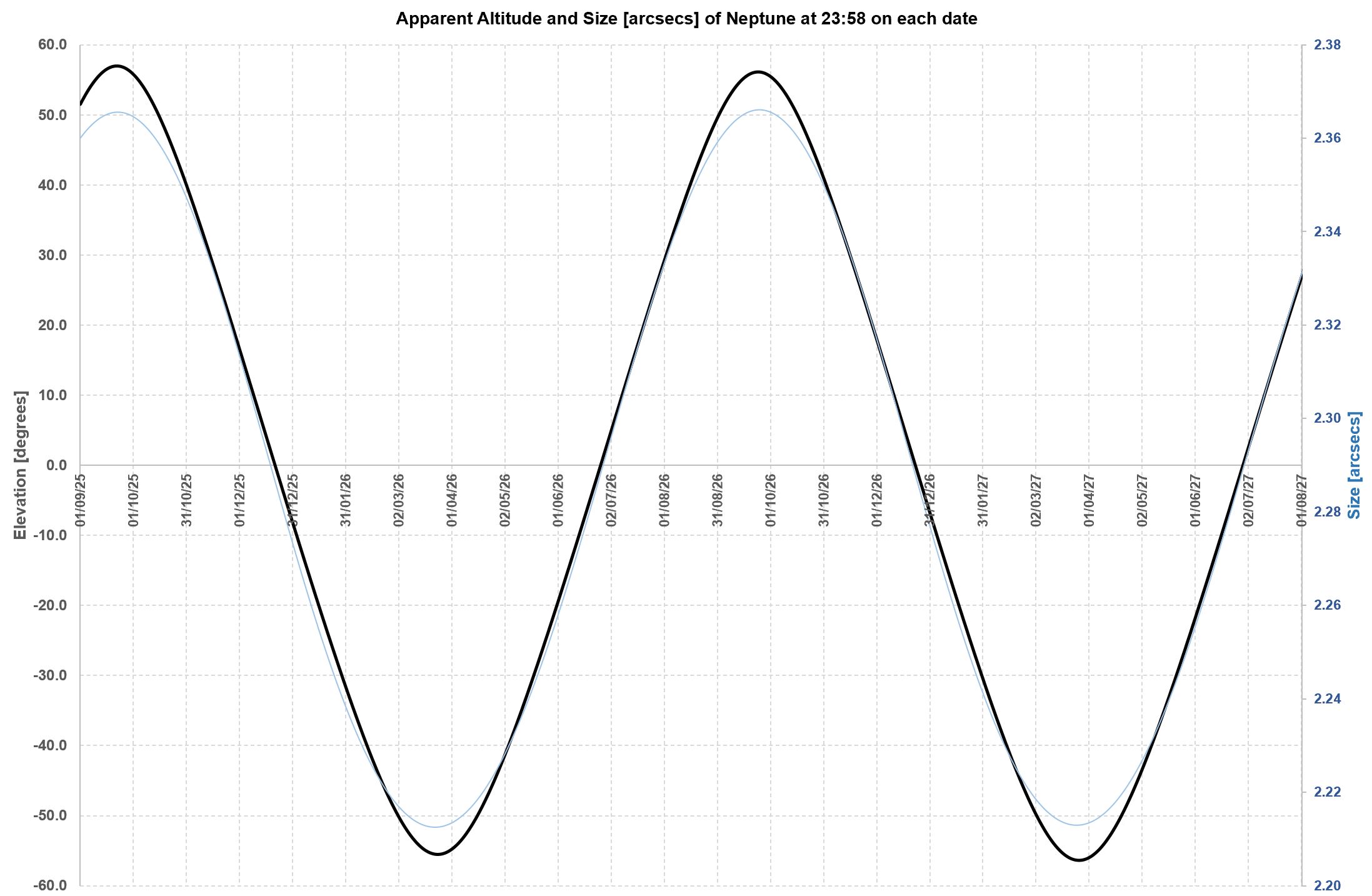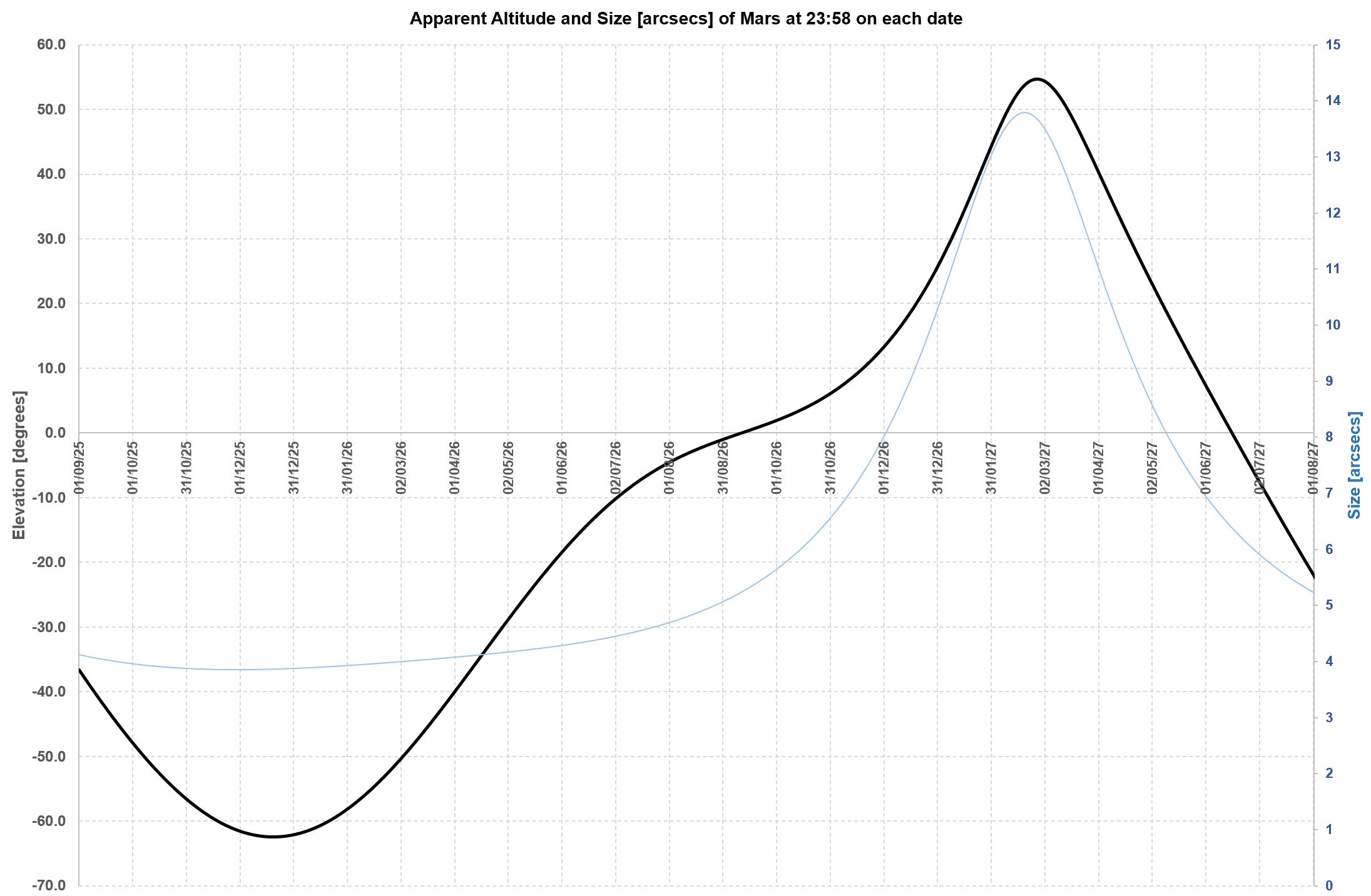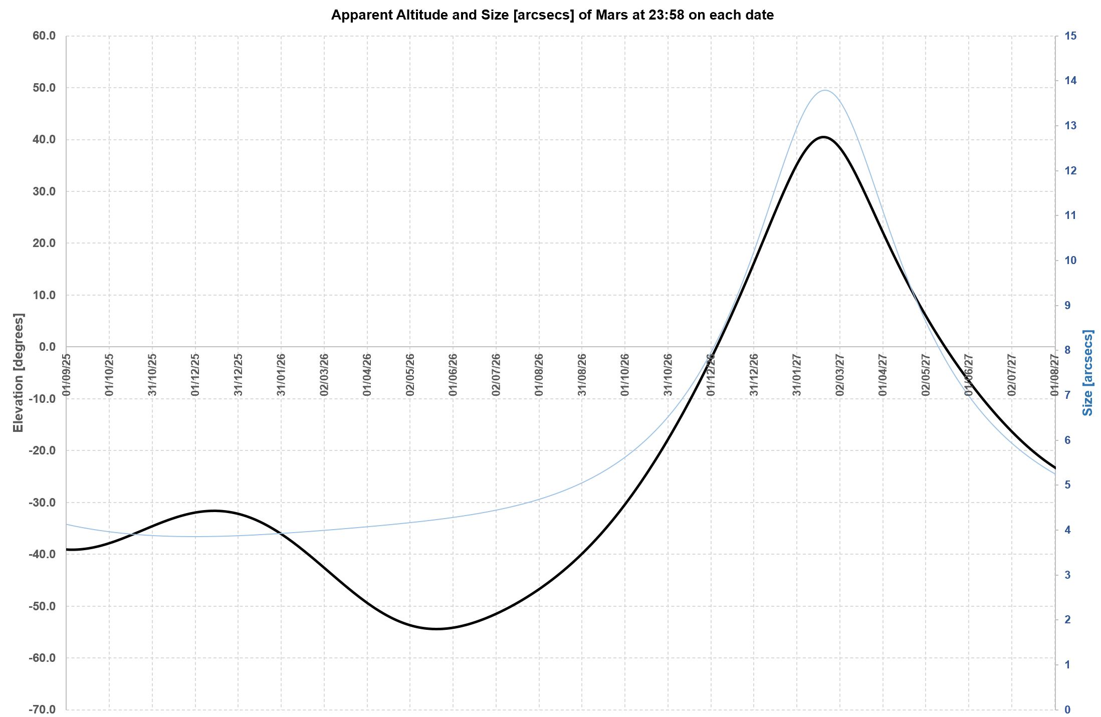 relative to each other every two-ish years. A chart of Mars’ altitude (to an Earth-bound observer) will show a roughly two-year periodic pattern. Put another way, if