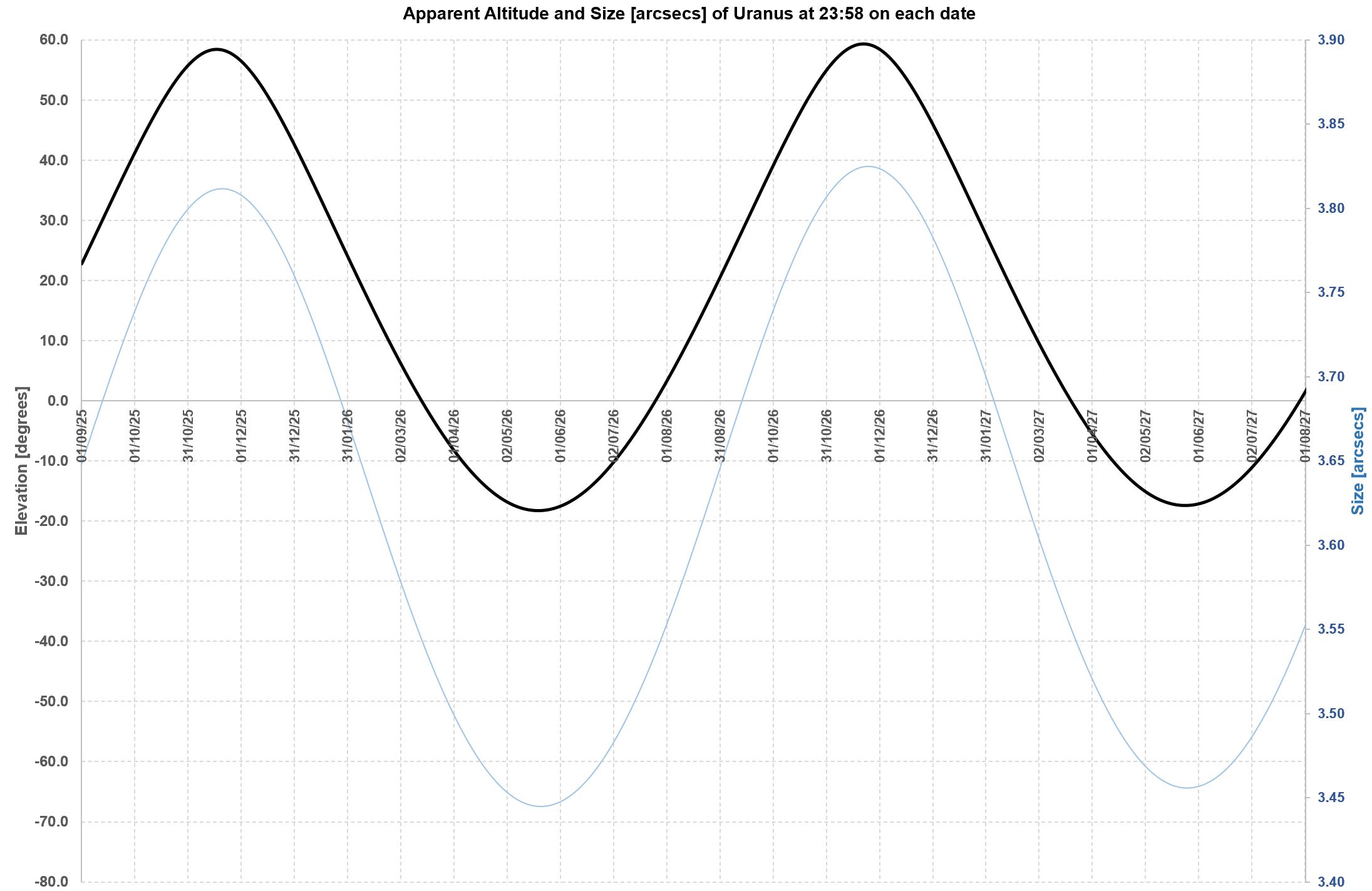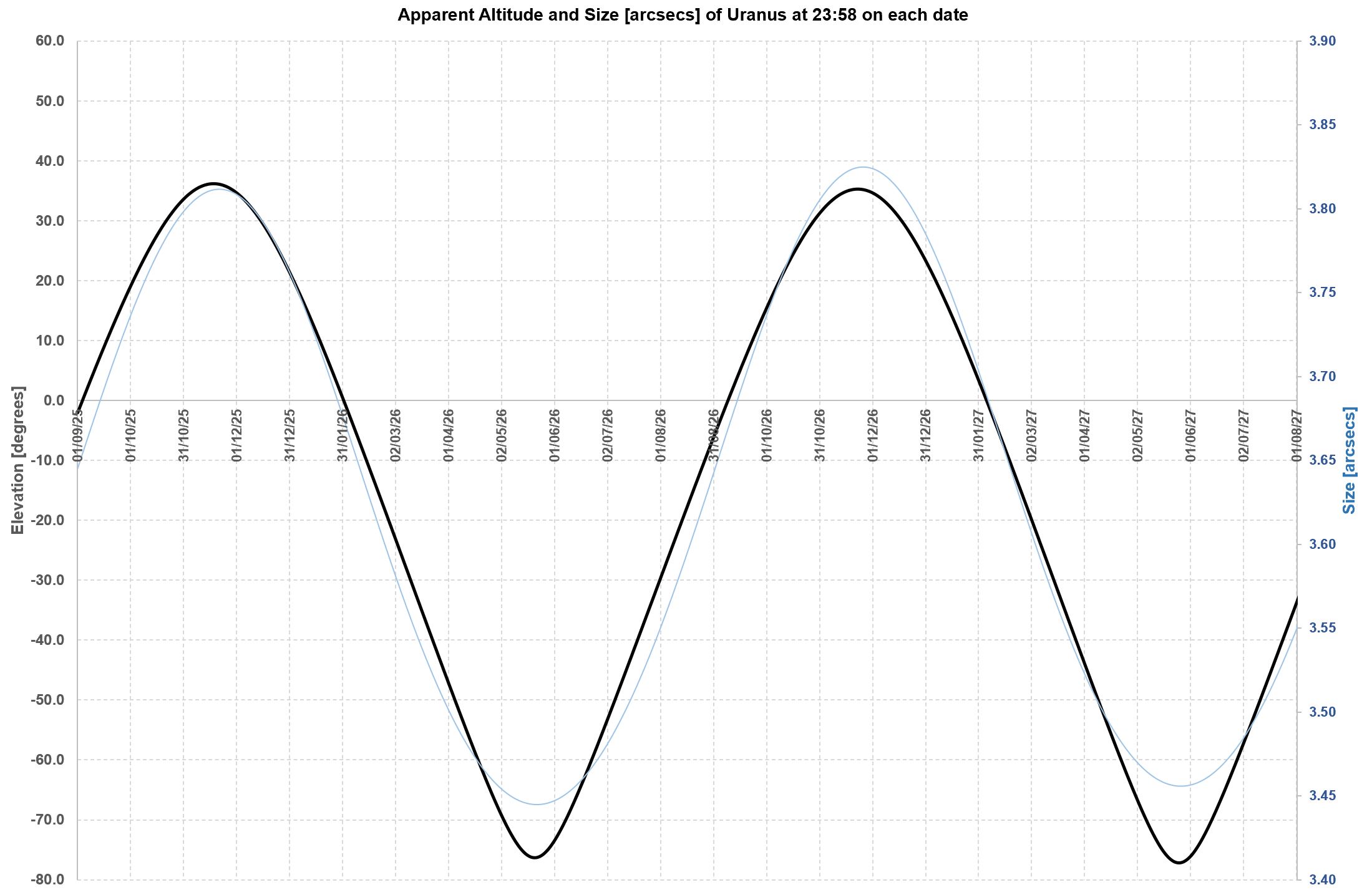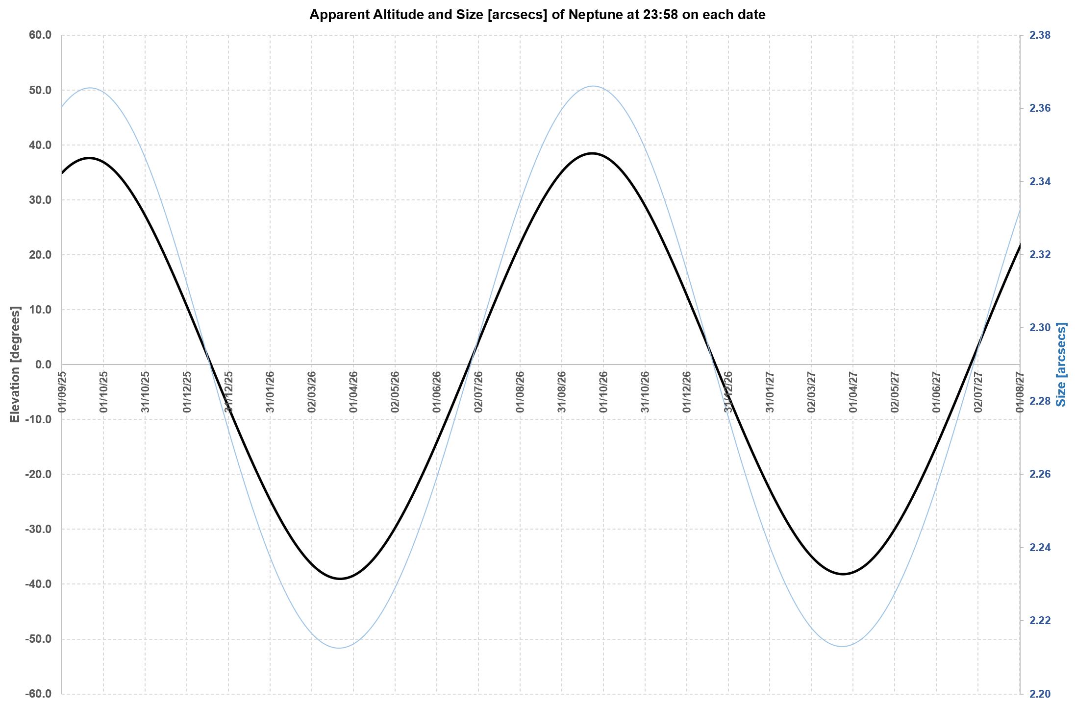 relative to each other every two-ish years. A chart of Mars’ altitude (to an Earth-bound observer) will show a roughly two-year periodic pattern. Put another way, if