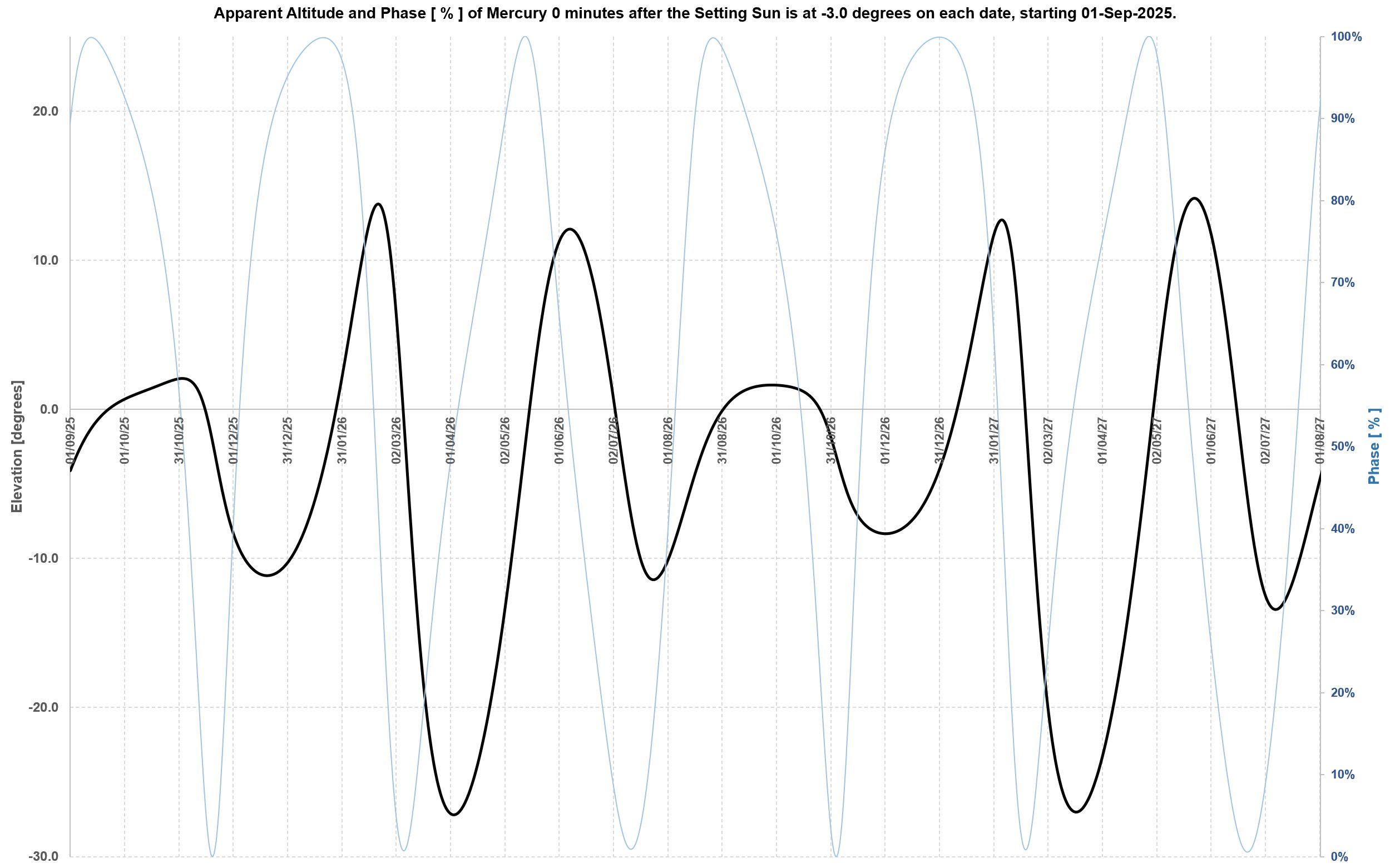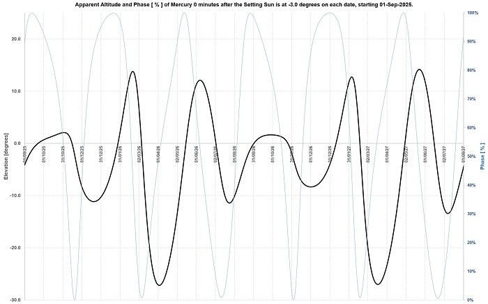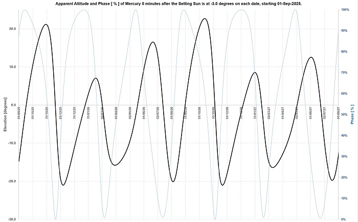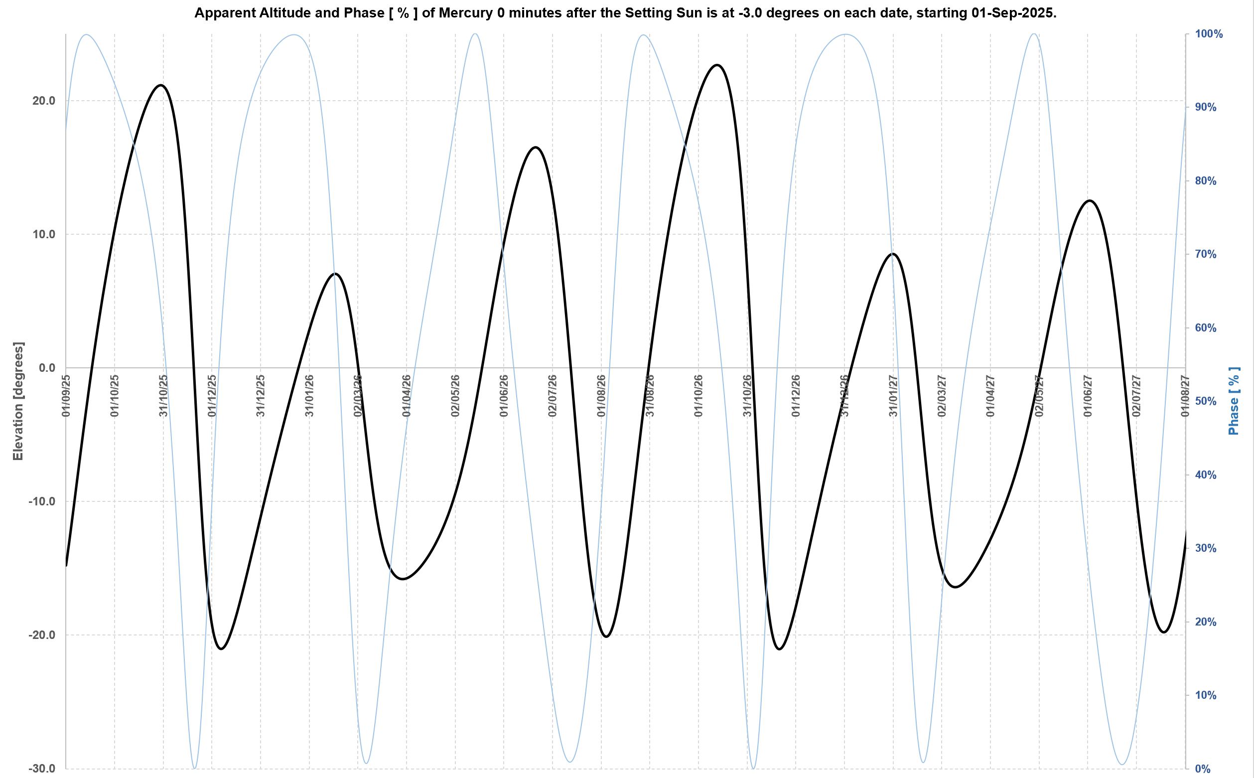 the Sun is 3 degrees below the horizon. They also show, in light blue on a scale from 0% to 100% the phase of Mercury, i.e. how much of a crescent or