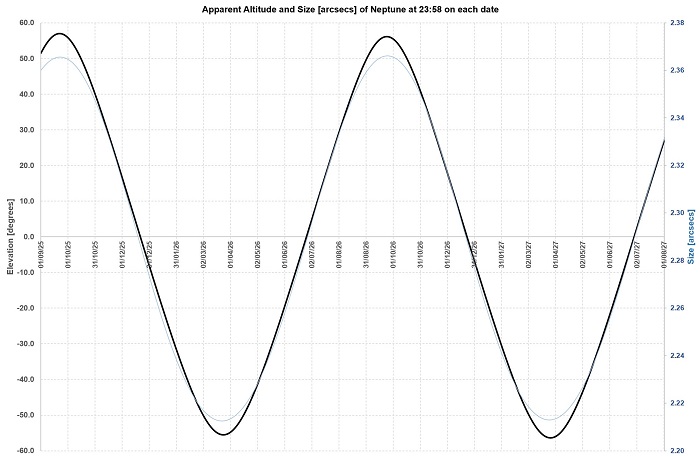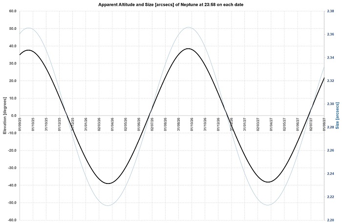 Neptune is better from the South than from the North, reaching over 55 degrees altitude as opposed to 38 for Northerners, in each case culminating