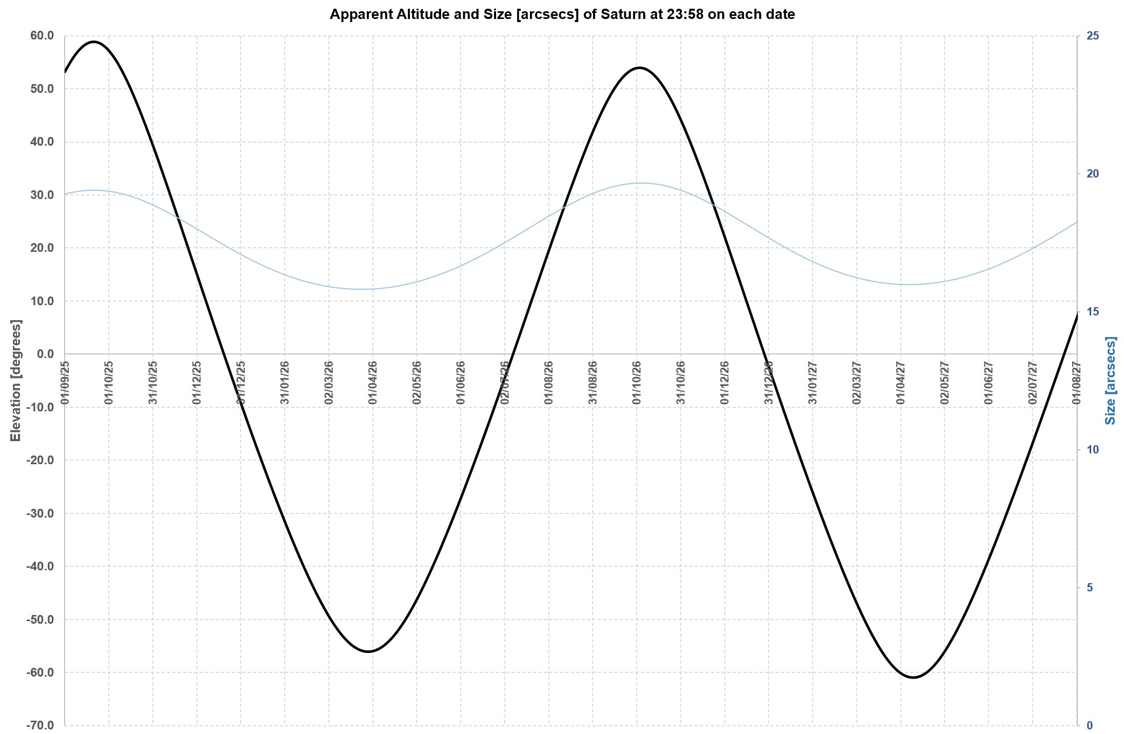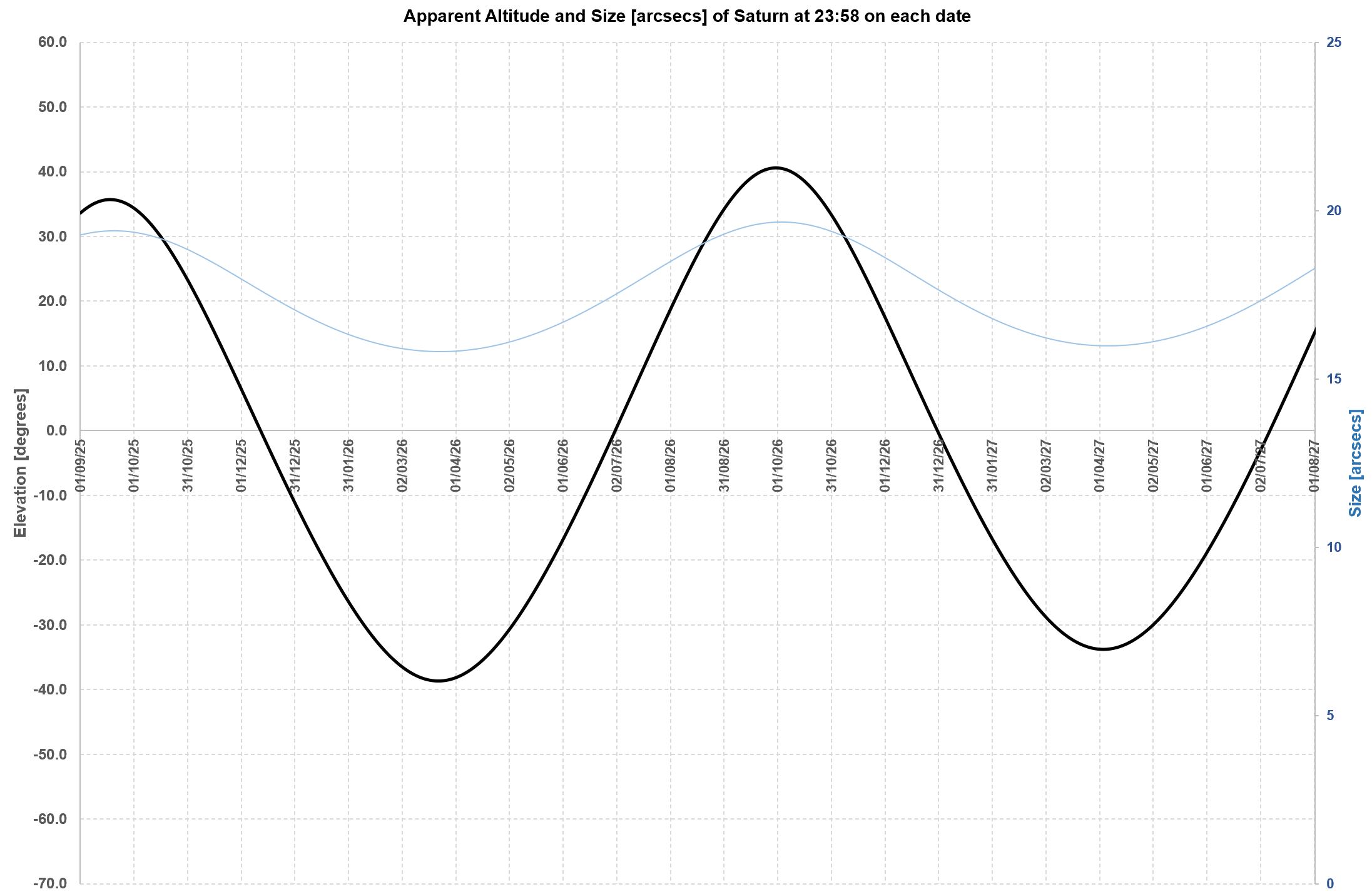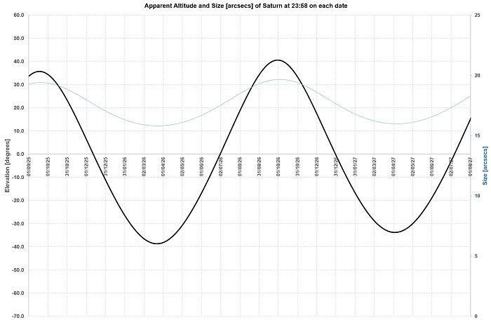 couple of annual apparitions (as from Sep 2025) Saturn gets higher for the SH than for the NH. Saturn will reach 45 degrees altitude at the start of
