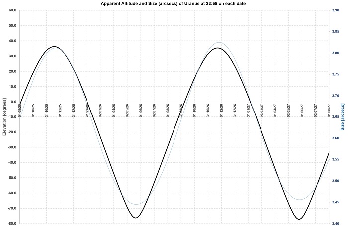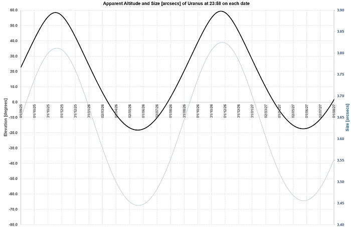 Uranus is better for Northern observers than for Southerners, reaching nearly 60 degrees up each apparition, culminating November each year.