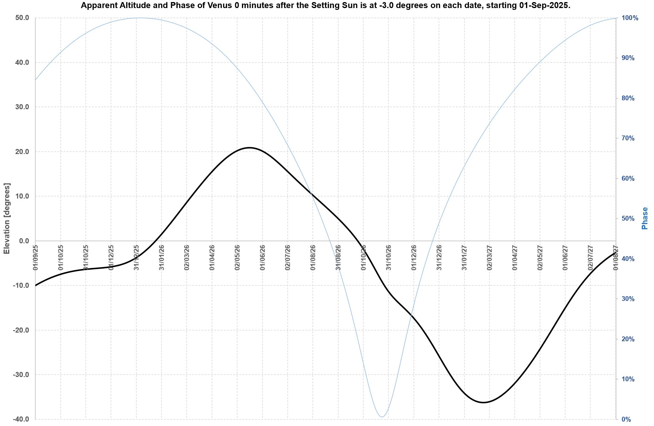 Venus’ chart is plotted as her elevation as sunset. Actually she's best to observe before that because she’s so bright, but either way the chart tells the same