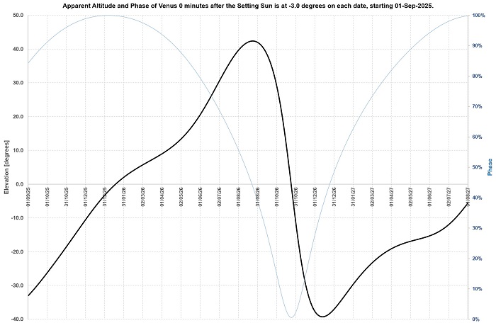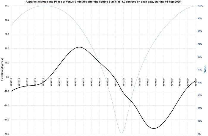 For the SH, again starting to rise as an “evening star” from January 2026, Venus will rise to as much as 40 degrees up by August, before “crashing “ down very